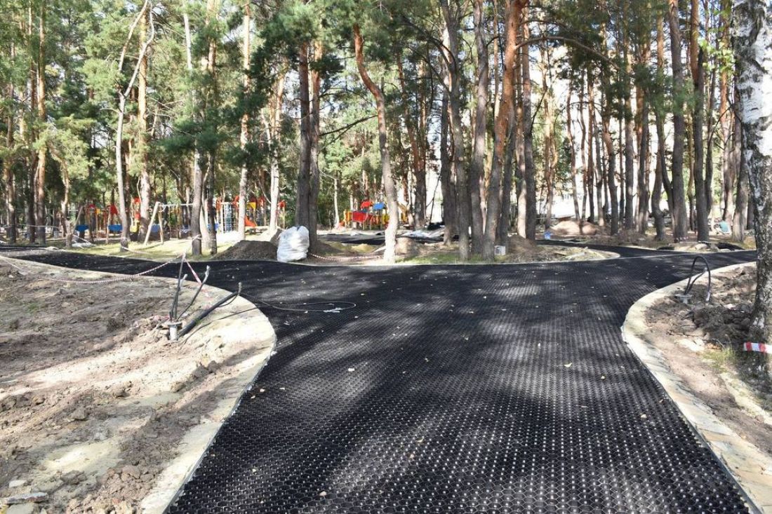 На главных пешеходных зонах подрядная организация выложила георешетки с последующим заполнением гранитным отсевом. Материал выбрали исходя из соображений максимальной экологичности. Декоративная плитка использована в качестве покрытия в зоне главного входа.