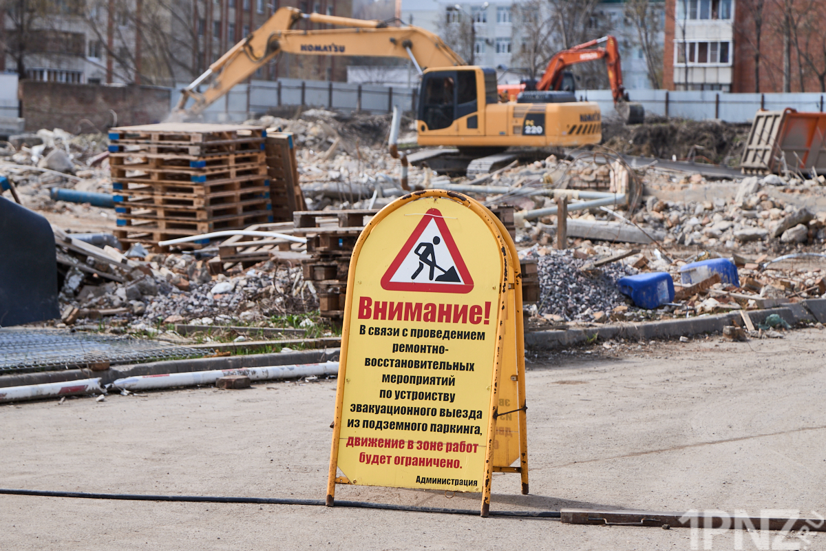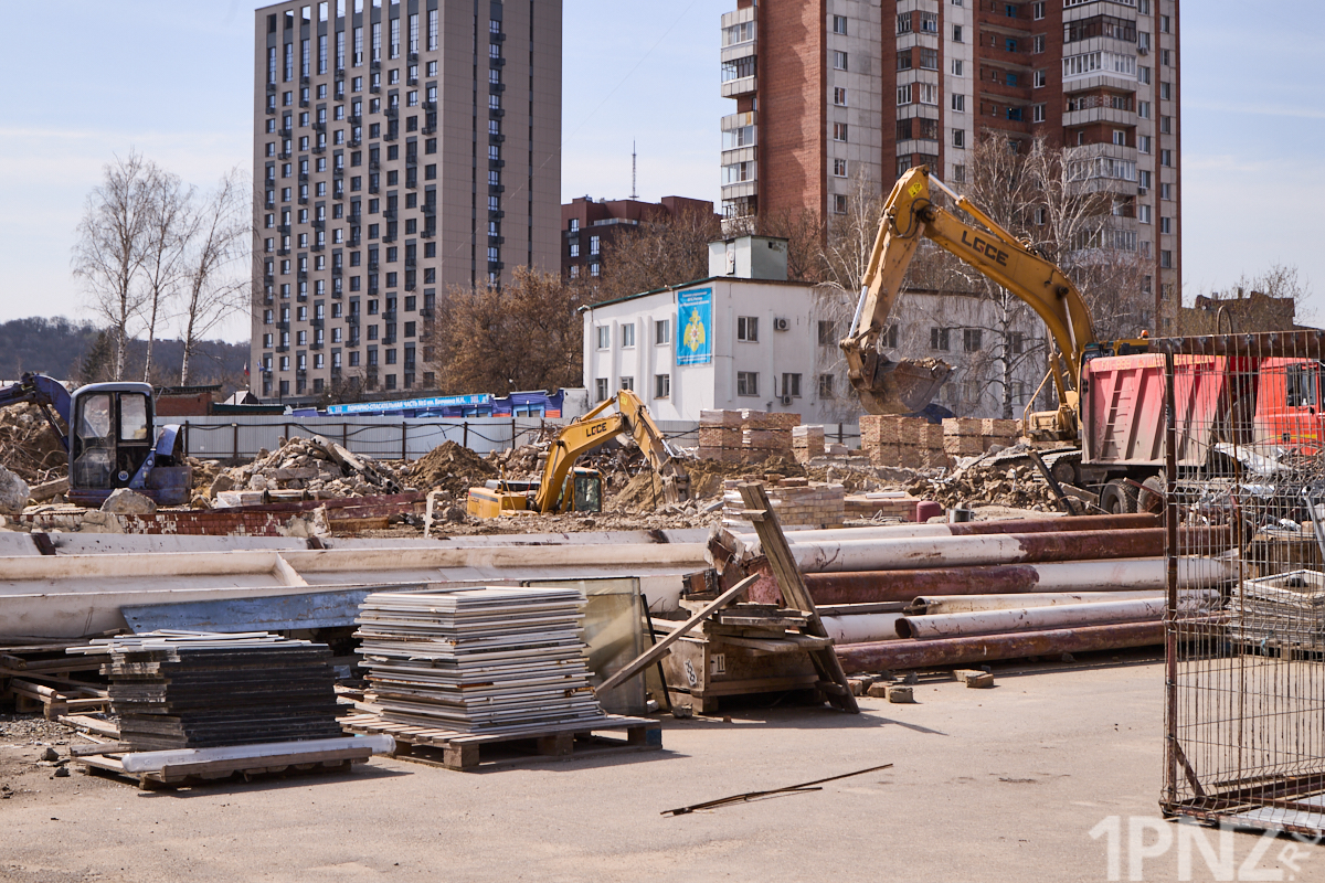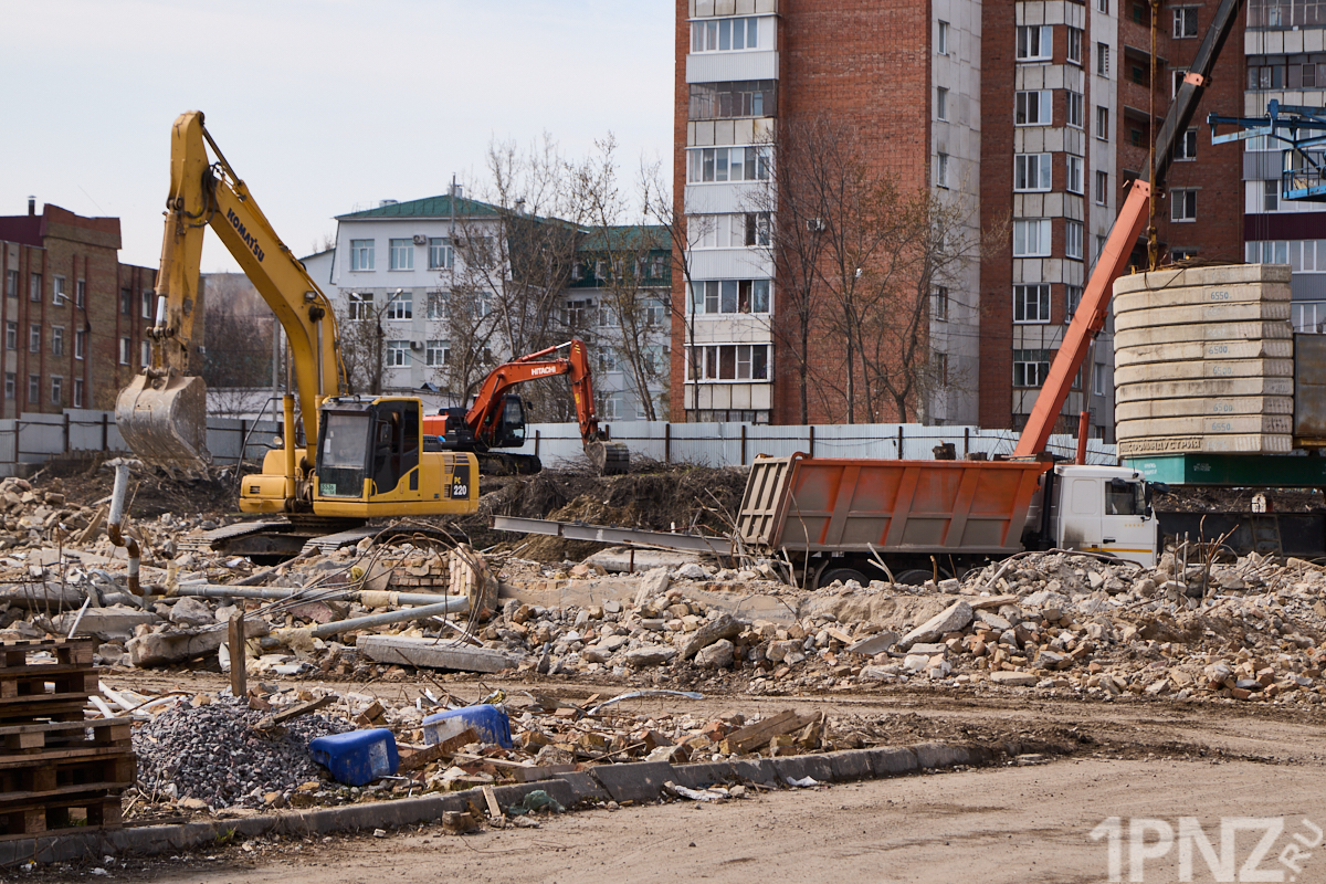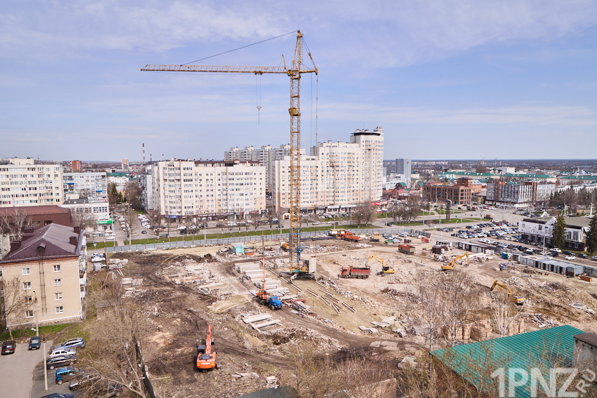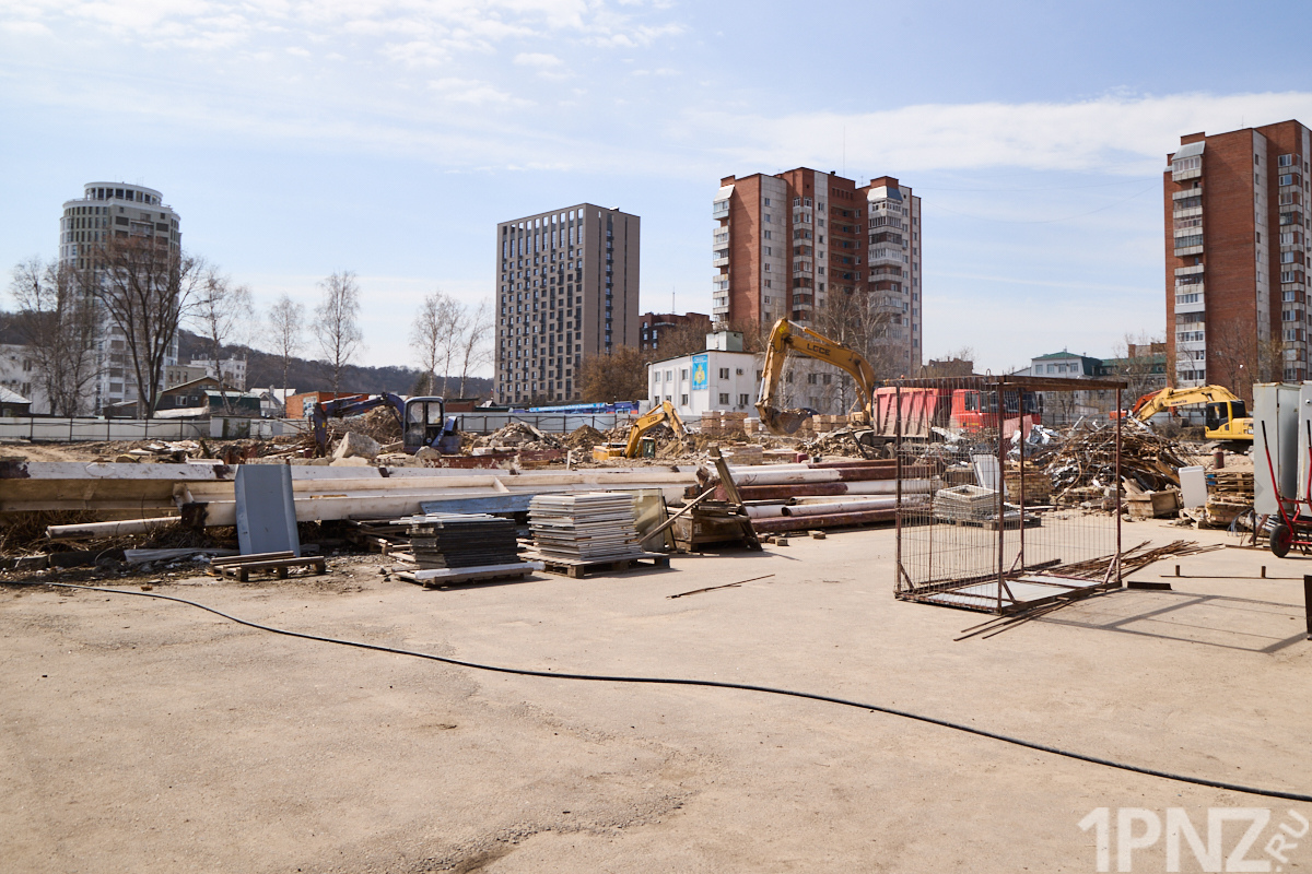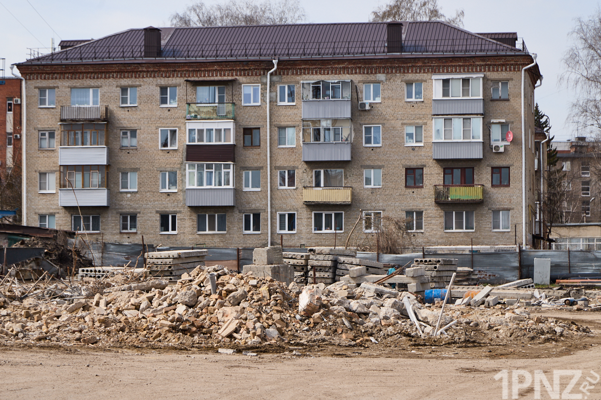 15 апреля 2026 года вместо многоэтажного здания бело-персикового цвета – только бетон и железные балки. Территория ограждена забором с логотипом известного пензенского застройщика.