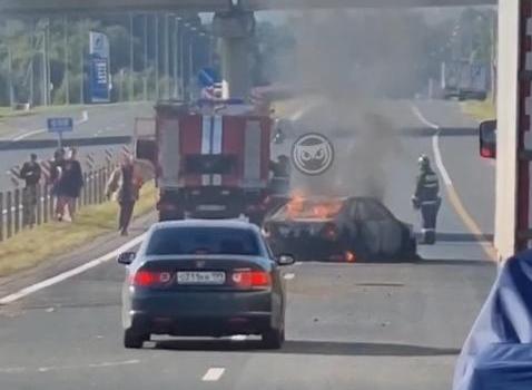 На кадрах запечатлены пожарные и догорающий на проезжей части автомобиль. Известно, что инцидент спровоцировал пробку на данном участке пути.