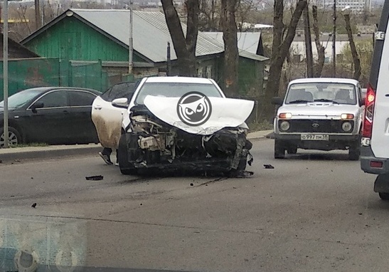 Участниками столкновения стали как минимум две машины, одна из которых получила очень серьезные повреждения: передняя часть автомобиля превратилась в бесформенное железное месиво. На другом снимке запечатлена стоящая на газоне иномарка, рядом с которой сидит человек.