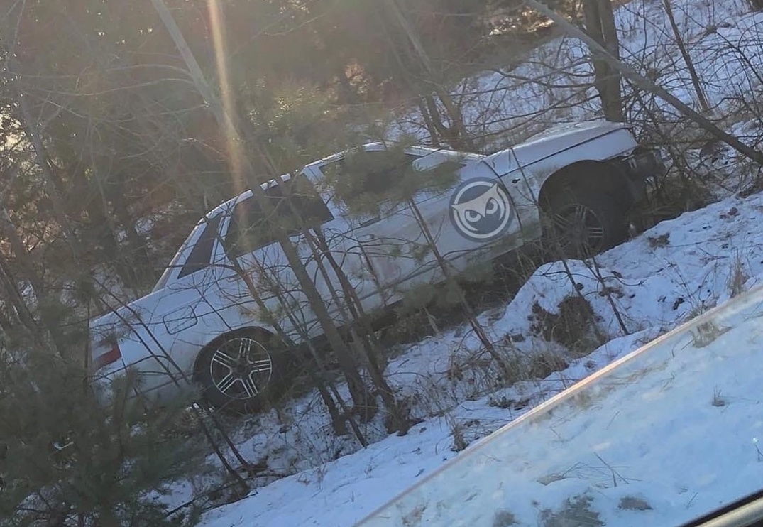 Судя по снимку, водитель легковушки по каким-то причинам не справился с управлением, отчего машина вылетела в кювет и врезалась в дерево.