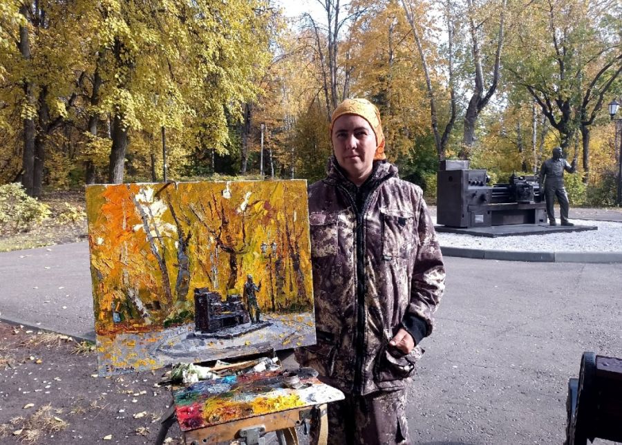 «Мы давно хотели написать такую картину. Осень – самое лучшее для этого время. Все деревья – в золоте, мягкий свет, облетевшие листья на асфальте… Памятник токарю на этом фоне выглядит особенно», – рассказал Андрей Вилков.